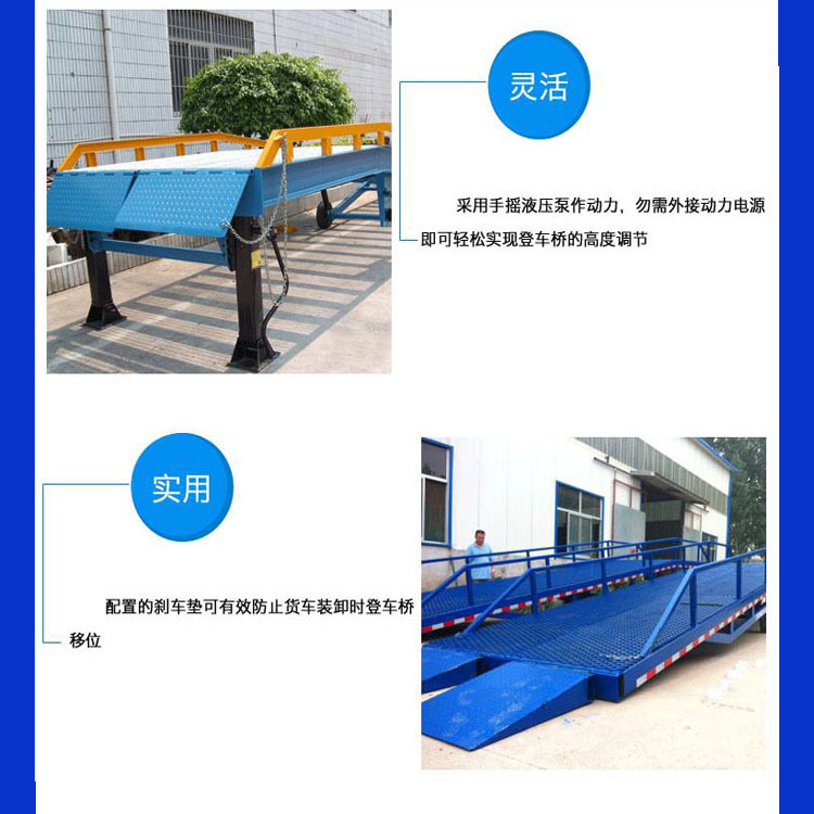 移動式登車橋應(yīng)用于無裝卸站臺或裝卸位置不固定以及裝卸場地狹小等場合,實(shí)現(xiàn)了貨物快速裝卸。通過它使叉車等搬運(yùn)車輛直接進(jìn)入貨車、集裝箱、列車車廂裝卸貨物,大大的提高了工效。登車橋采用手動液壓操縱,無需其它動力,能適用于各種裝卸場合;登車橋采用支腿支撐和網(wǎng)格狀鋼板結(jié)構(gòu),有更可靠的安全性能。